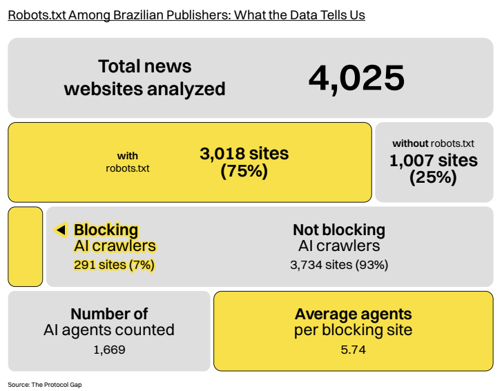 A new report, The Protocol Gap: Brazil, reveals that most Brazilian news websites are not taking basic steps to control how artificial intelligence companies use their content. As of November 2025, 7.2% of Brazilian news sites block at least one “AI crawler” through their robots.txt files, even though 75% have the file installed.